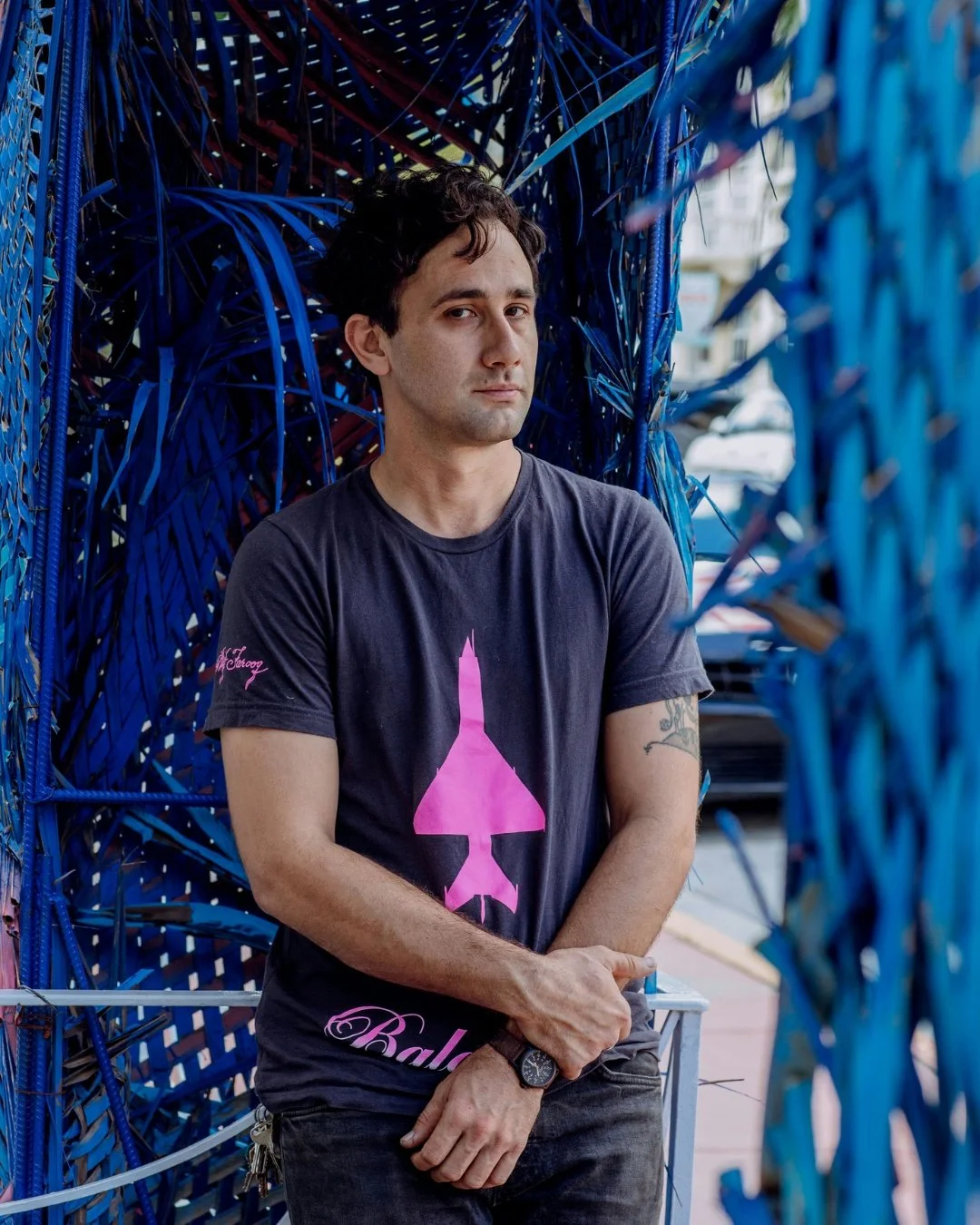 Material is central to this inquiry. Rook works with forged steel, painted palm fronds, and handwoven rope made from reclaimed textiles, pairing rigid industrial elements with organic and flexible ones. These combinations operate as metaphors for permanence and fragility, resilience and adaptation. The materials also carry associations to labor, migration, and place, particularly within the context of Miami’s shifting and rapidly developing landscape.